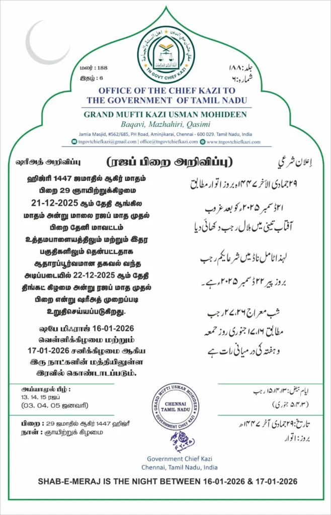 The Office of the Chief Kazi to the Government of Tamil Nadu hereby announces that Shab-e-Meraj will be observed on the night between Thursday, 16 January 2026, and Friday, 17 January 2026, corresponding to 29th Rajab 1447 Hijri.